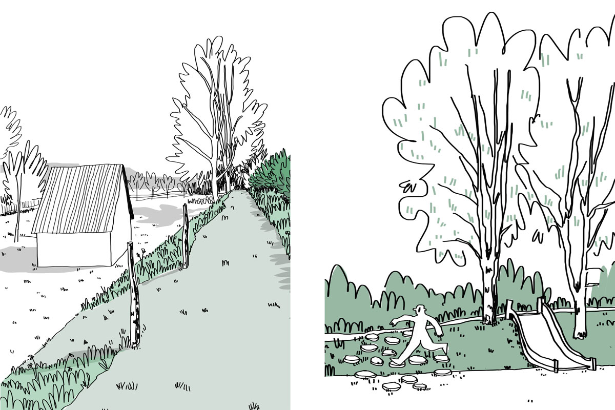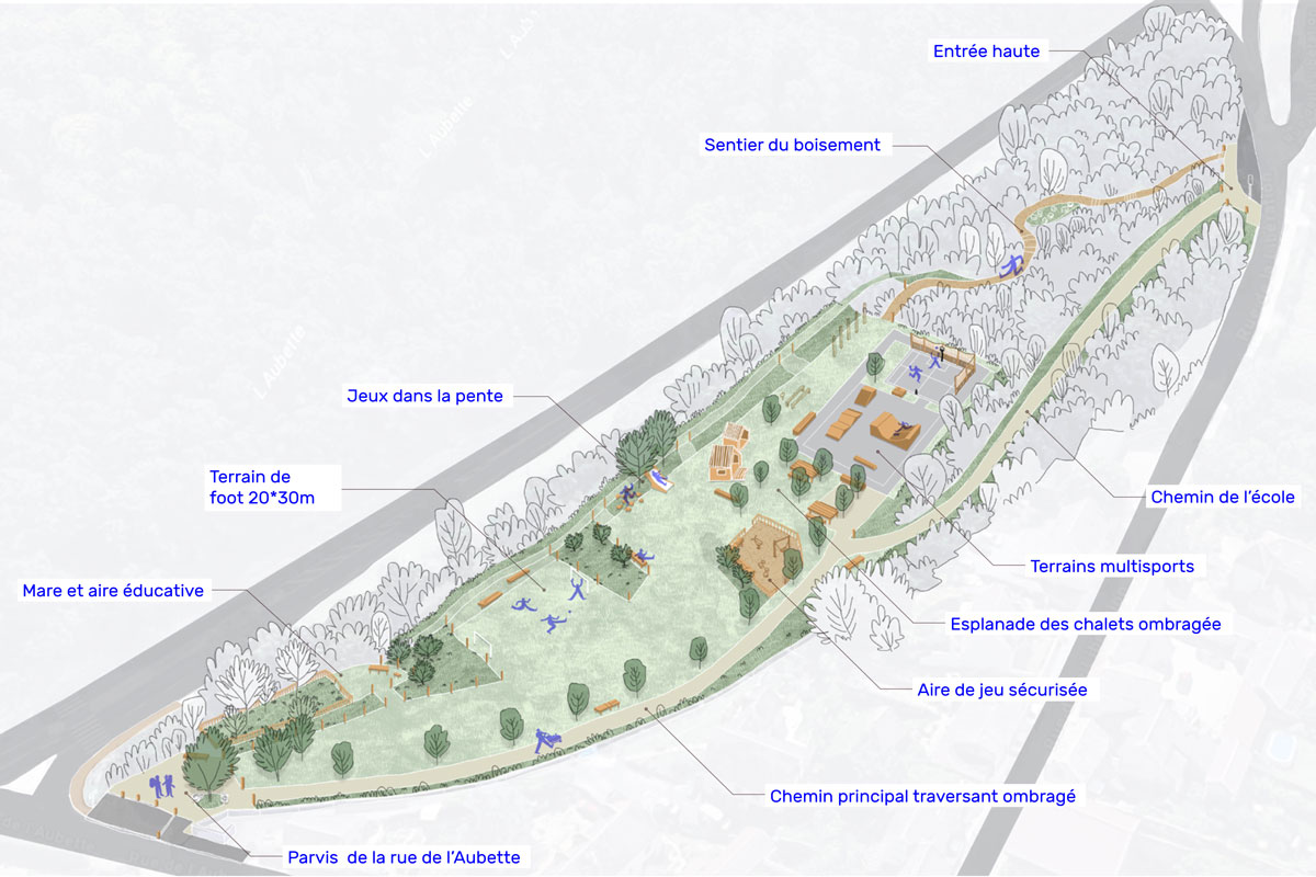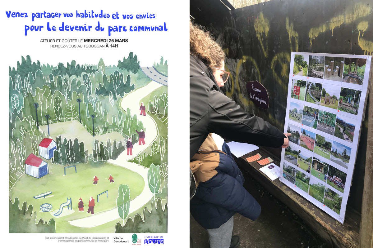 Accompagnée par le Parc Naturel Régional du Vexin Français, la commune de Condécourt a fait appel à l’Atelier de l’Ours pour la réalisation d’une étude d’avant-projet pour l’aménagement de son parc communal. Le parc possède une situation privilégiée au cœur de parcours quotidiens et de grands itinéraires de randonnées Vexinois, bien que ses équipements et accès soient vieillissants. Après une première phase de diagnostic partagé avec les habitants, l’Atelier propose un plan de restructuration du parc s’appuyant sur ses modelés et structures existantes. Le projet garantit une traversée confortable en toute saison du parc tout en assurant des parcours secondaires à travers le boisement et le talus. Le projet est structuré autour de la conservation d’un grand espace libre tondu pouvant accueillir des évènements temporaires et le ménagement d’espaces de pause intimes et ombragés à travers des prairies hautes. L’organisation des aires ludiques et sportives s’incarne par la rénovation d’une partie des terrains de tennis en une aire sportive modulable et multiple, ainsi que par l’utilisation du talus pour l’installation de jeux dans la pente.