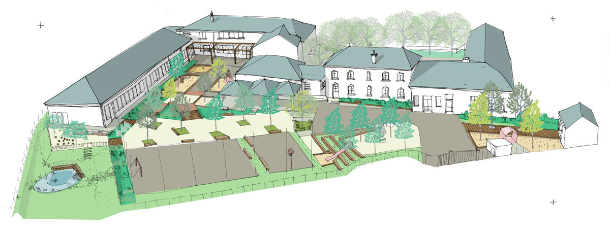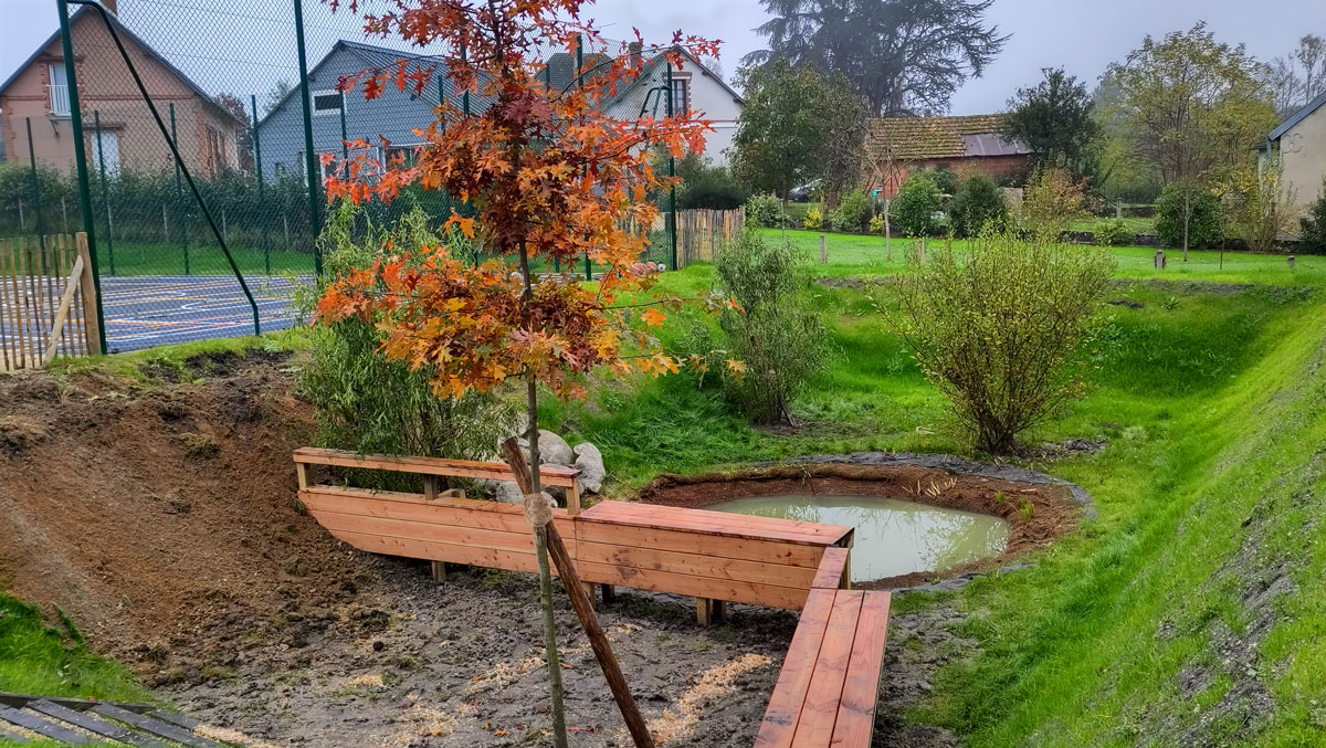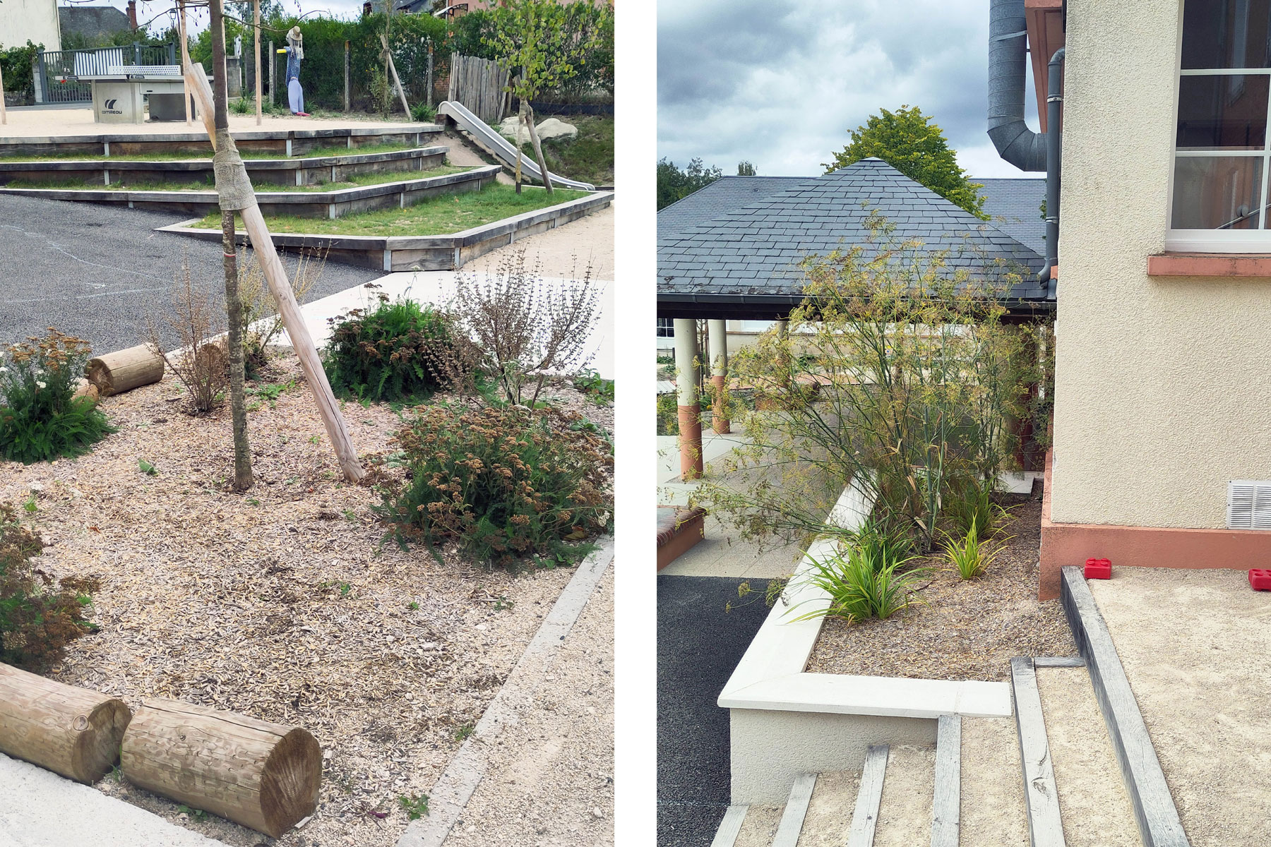 Le projet prévoit entre autre la désimpérméabilisation d’une grande partie des sols et la déconnexion d’une grande partie de la cour, la création d’une mare, la plantation d’une trentaine d’arbres, la gestion d’un dénivelé important et la création d’espaces ombragés et calmes.