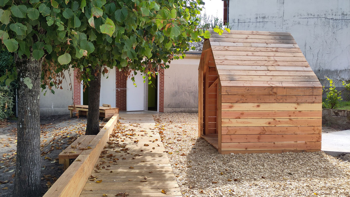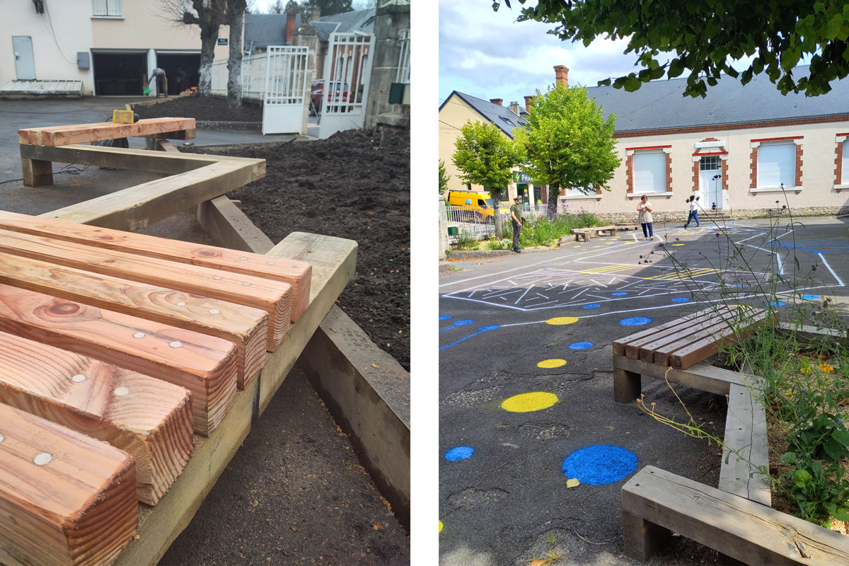 Dans le cadre de notre mission, nous avons également mené un petit chantier de construction dans la cour de devant. La mairie souhaitait y faire des travaux plus légers avant de définir de prendre le temps à la réflexion du programme. L’Atelier est intervenu à la construction de mobiliers autour de massifs décroutés dans l’enrobé par les services municipaux puis plantés avec les enfants encadrés par le CAUE 41. Nous avons également réalisé les marquages ludiques avec les outils de la municipalité et la participation du CAUE.
