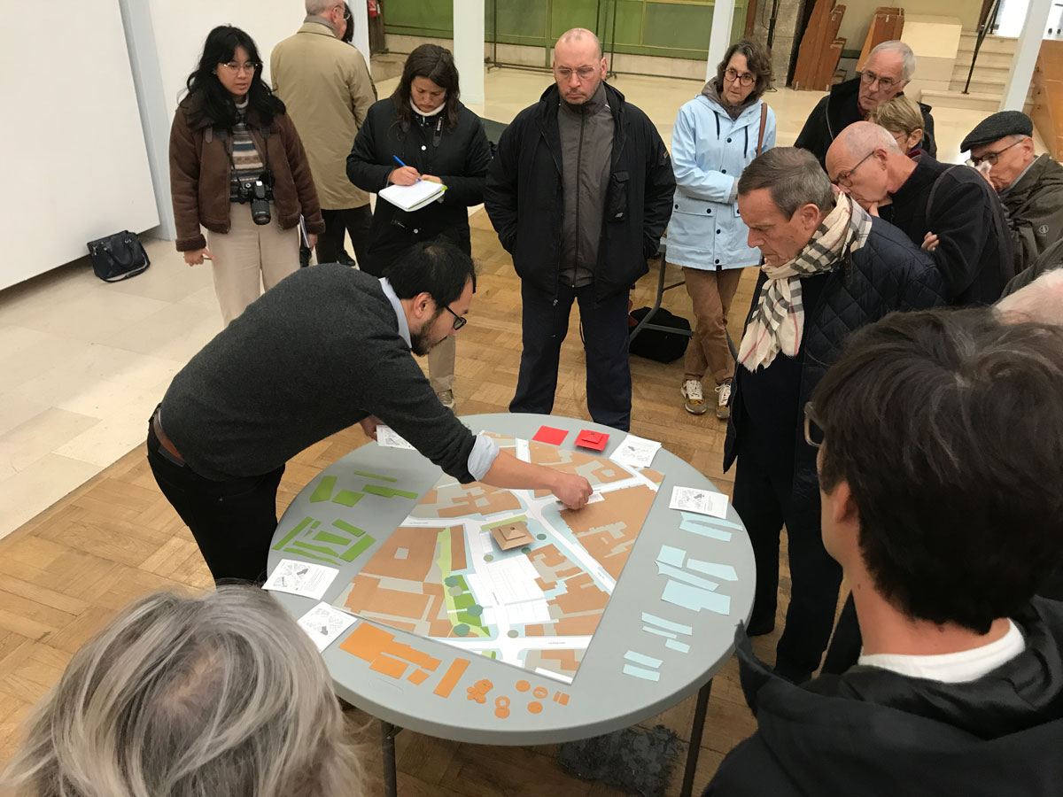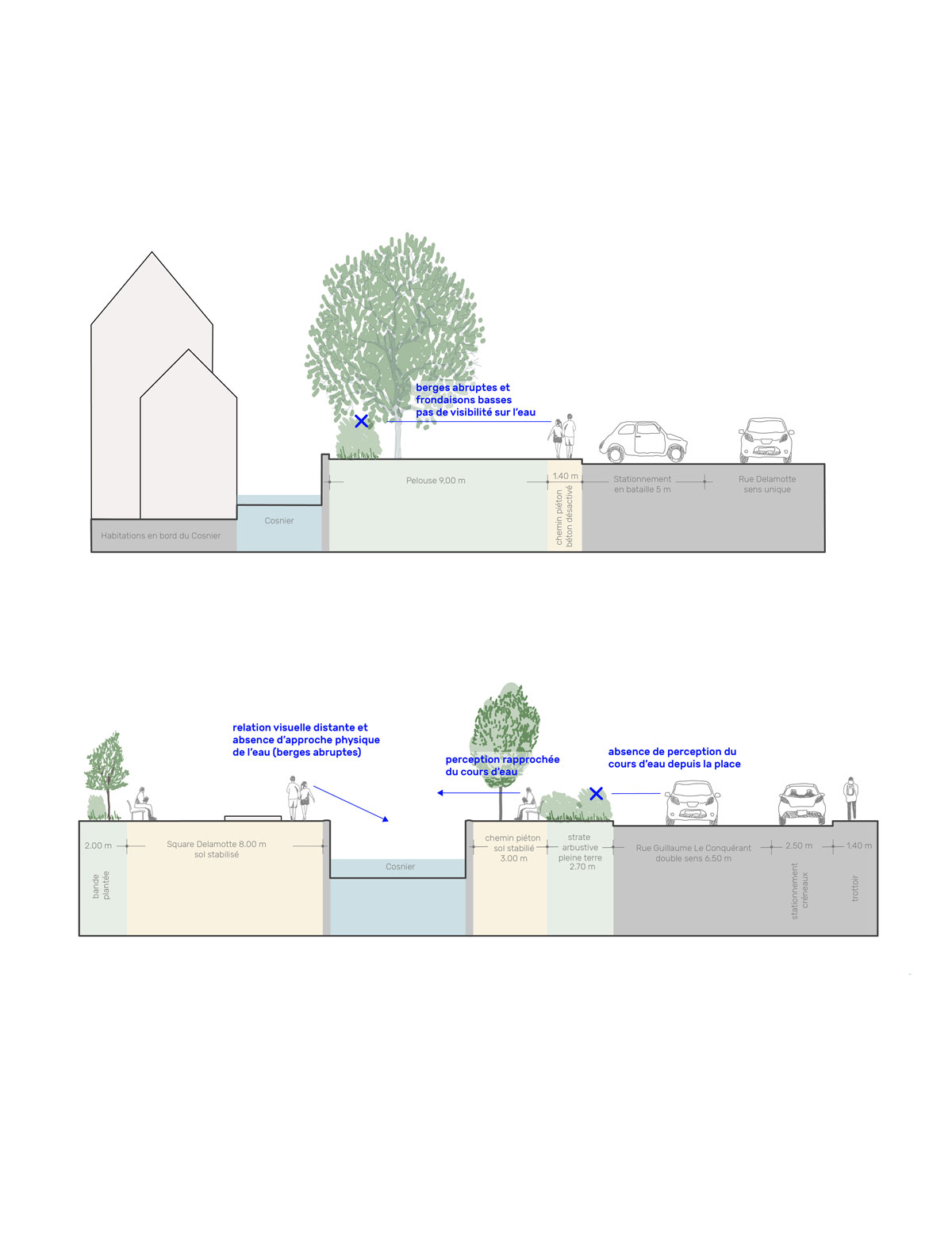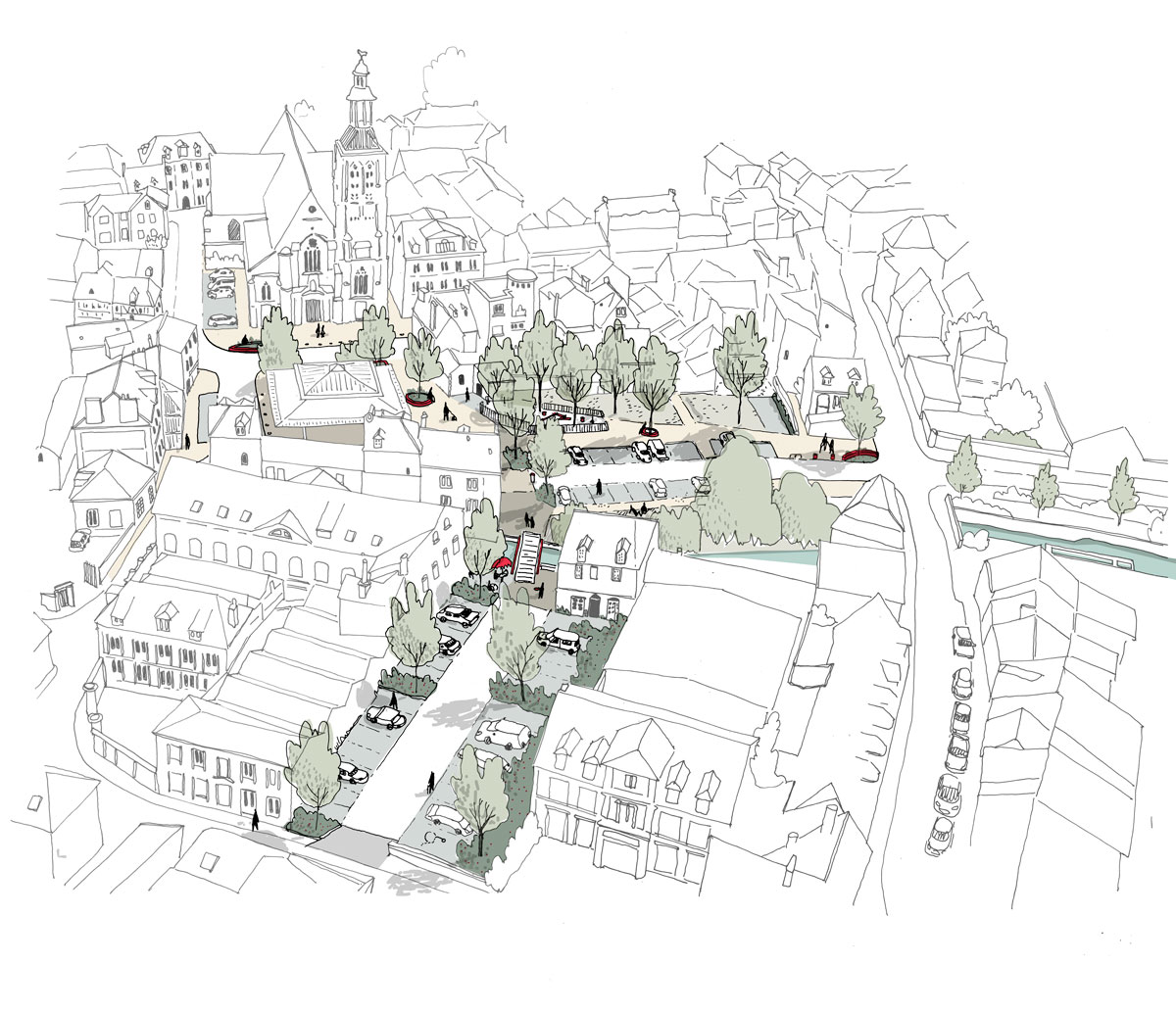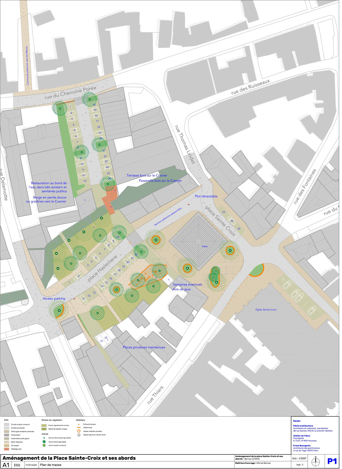 La place Sainte-Croix est l’un des espaces publics structurants du cœur commercial de la ville de Bernay. Malgré la richesse des patrimoines naturels et architecturaux qui composent ce site, la prédominance d’espaces de stationnement et de circulation pour les voitures la rend difficile d’appropriation pour les piétons. À l’issue d’un état des lieux co-construit, l’objectif de cette étude de programmation est d’esquisser une nouvelle place Sainte-Croix. Le projet proposé valorise la halle centrale en supprimant les espaces de stationnement à ses pieds et retisse des liens avec la rivière du Cosnier en inscrivant des espaces de convivialité et de circulation pour les piétons en regard du cours d’eau.