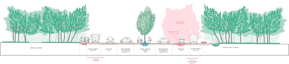 La nouvelle configuration de la halte touristique du port Giffard doit répondre à des objectifs d’ordre fonctionnel tout en s’inscrivant dans le cadre remarquable du site classé de la commune distinguée parmi « les plus beaux villages de France ». Il s’agit d’assurer une meilleure praticabilité du parking par une amélioration des revêtements de sol et de la gestion des eaux de ruissellement compte tenu des nombreuses ornières et zones d’accumulation d’eau observées. Les emplacements bus sont réorganisés de sorte à s’adosser aux frondaisons boisées du site afin d’en diminuer la présence visuelle. Le vocabulaire d’aménagement est adapté à l’intensité d’usage des différentes pièces de stationnement. Ainsi, un soin tout particulier est apporté au parking d’entrée de manière à répondre à sa fréquentation plus importante, tandis que les aires de stationnement secondaires sont aménagées plus sommairement. Les parcours piétons sont imaginés à la fois pour des usages quotidiens confortables et allant au plus court, mais aussi pour les nombreux visiteurs de sorte à les orienter vers les points d’intérêts de la commune. Une attention particulière est portée sur la création d’un parvis piéton en entrée de site afin d’accueillir différents services, de valoriser l’ancienne pile de pont et d’affirmer la dimension de halte touristique des lieux.