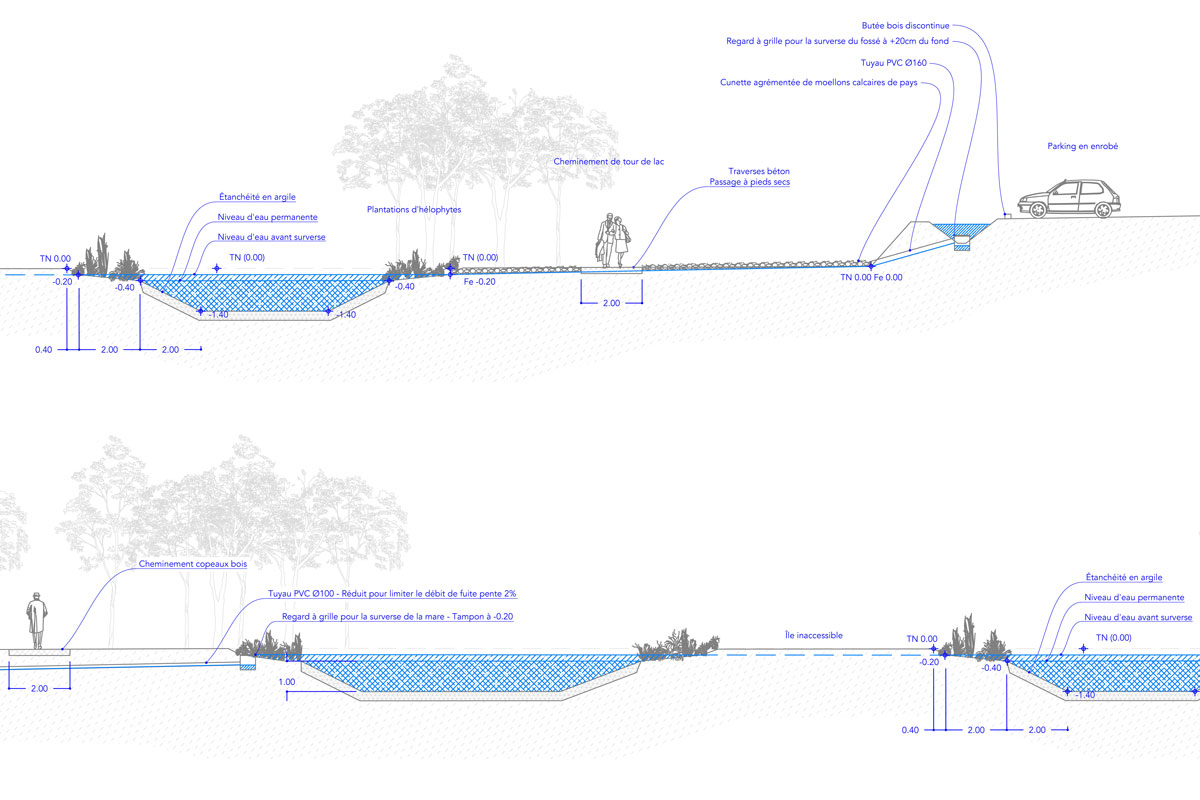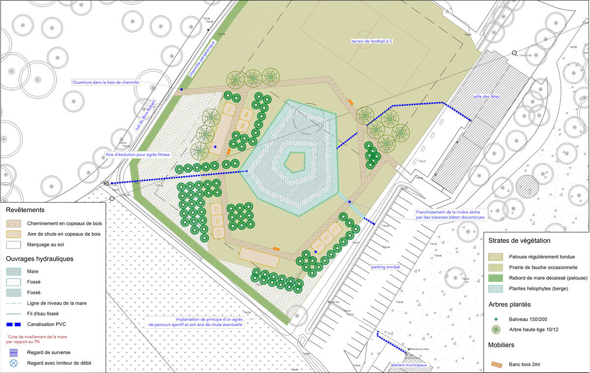 L’usage du terrain de football communal étant devenu plus occasionnel avec le temps et le déplacement du club local dans le village voisin, les élus de Breuil-Bois-Robert ont souhaité requalifier l’usage et la gestion de cet équipement sportif désormais surdimensionné. La création d’une mare d’agrément et en faveur de la biodiversité du site est ainsi envisagée sur la moitié Sud du terrain actuel. Sa moitié Nord est maintenue libre afin d’accueillir des événements communaux et de permettre la pratique du football à cinq sur un demi-terrain. Il est proposé d’organiser l’implantation d’agrès sportifs sur la moitié Sud au fil d’une boucle piétonne contournant le plan d’eau. Ces équipements sportifs discrètement inscrits sur la promenade permettent de ne pas interférer avec la vue remarquable ménagée vers le bourg et l’horizon lointain de la vallée de la Seine au Nord.