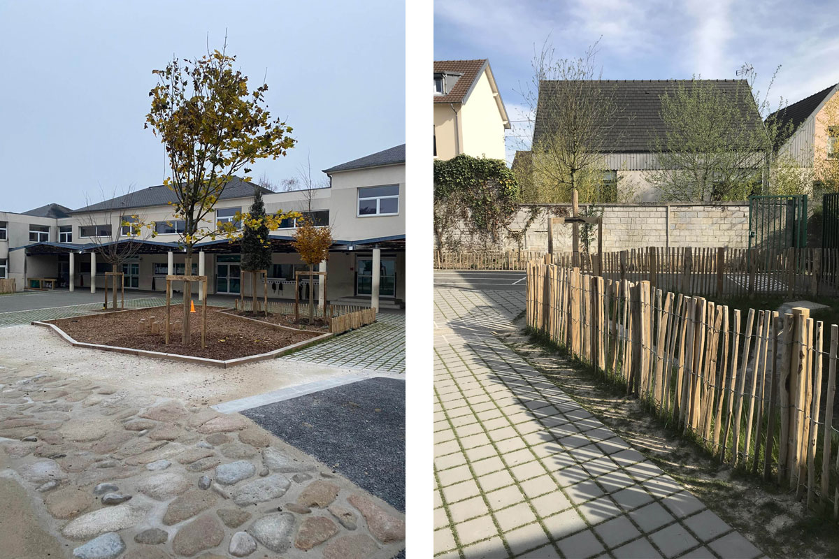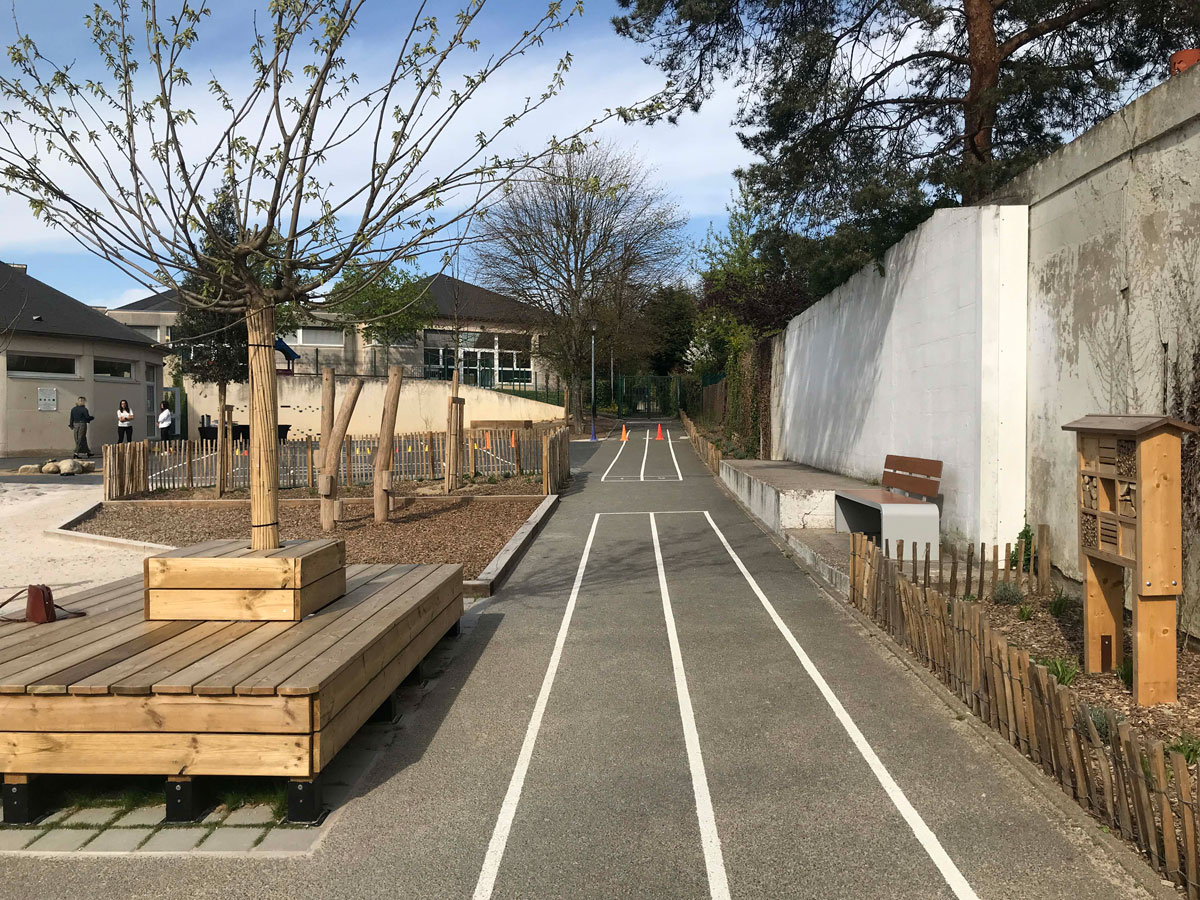 Dans le cadre de la politique que la commune mène pour rafraîchir et accueillir le vivant dans ses cours d’école, le projet propose une requalification ambitieuse de la cour Molière. Faire avec l’existant tout en améliorant l’occupation de l’espace, la mixité des usages et la capacité d’infiltration tel a été l’objectif transversal de ce projet. Le caniveau central, les niveaux finis existants et une partie des enrobés en bon état sont conservés. Le dessin du projet s’articule autour de ce caniveau existant qui est désormais traversé par différents matériaux et transformé en rivière pédagogique. Le terrain de foot est relocalisé en périphérie de la cour afin de faire la part belle à es zones calmes et végétalisées au centre de la cour. Des mobiliers et jeux bois et tirent partie de la topographie de certaines situations spécifiques de la cour et offrent de nombreuses assises ombragées pour les enfants.