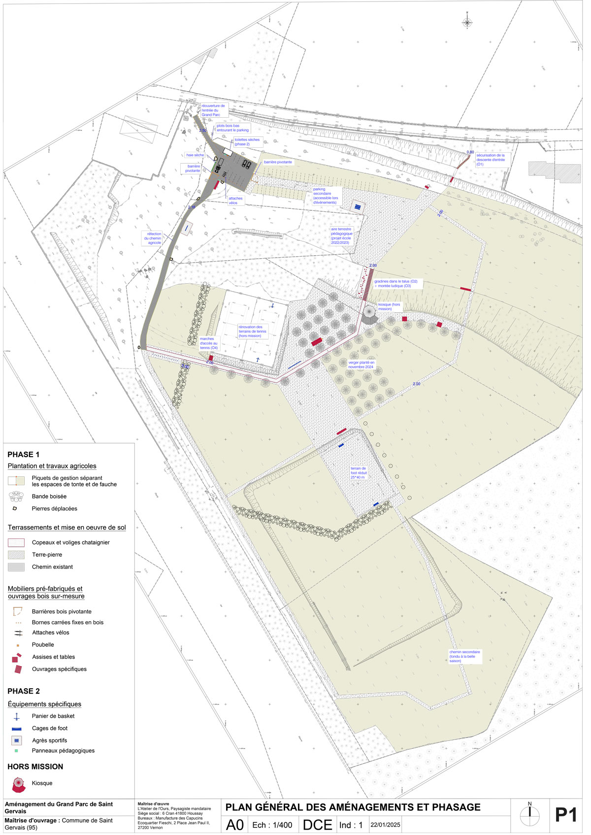Au départ est l’ambition des élus de Saint Gervais de « rendre aux habitants » 7 hectares d’espace naturel situés à l’entrée du village. Après un temps d’état des lieux du site et de validation d’un plan programme concerté, l’Atelier accompagne la commune dans le dessin opérationnel du projet de Grand Parc. Le projet s’incarne par des actions ponctuelles d’aménagement que révèlent en négatif le ménagement de grandes étendues et sa gestion future qui dessine l’espace et ses usages. Le parc est structuré autour de chemins principaux (copeaux de bois et terre-pierre) et de chemins secondaires, tondus selon la disponibilité de l’agent technique. Un verger a été planté avec les habitants pour démarrer la mise en œuvre du Grand Parc et fédérer autour de ce lieu collectif. Des mobiliers bois dessinés sur-mesure valorisent désormais certaines situations comme les solariums en haut du talus ou encore la grande table de pique nique au cœur du verger.