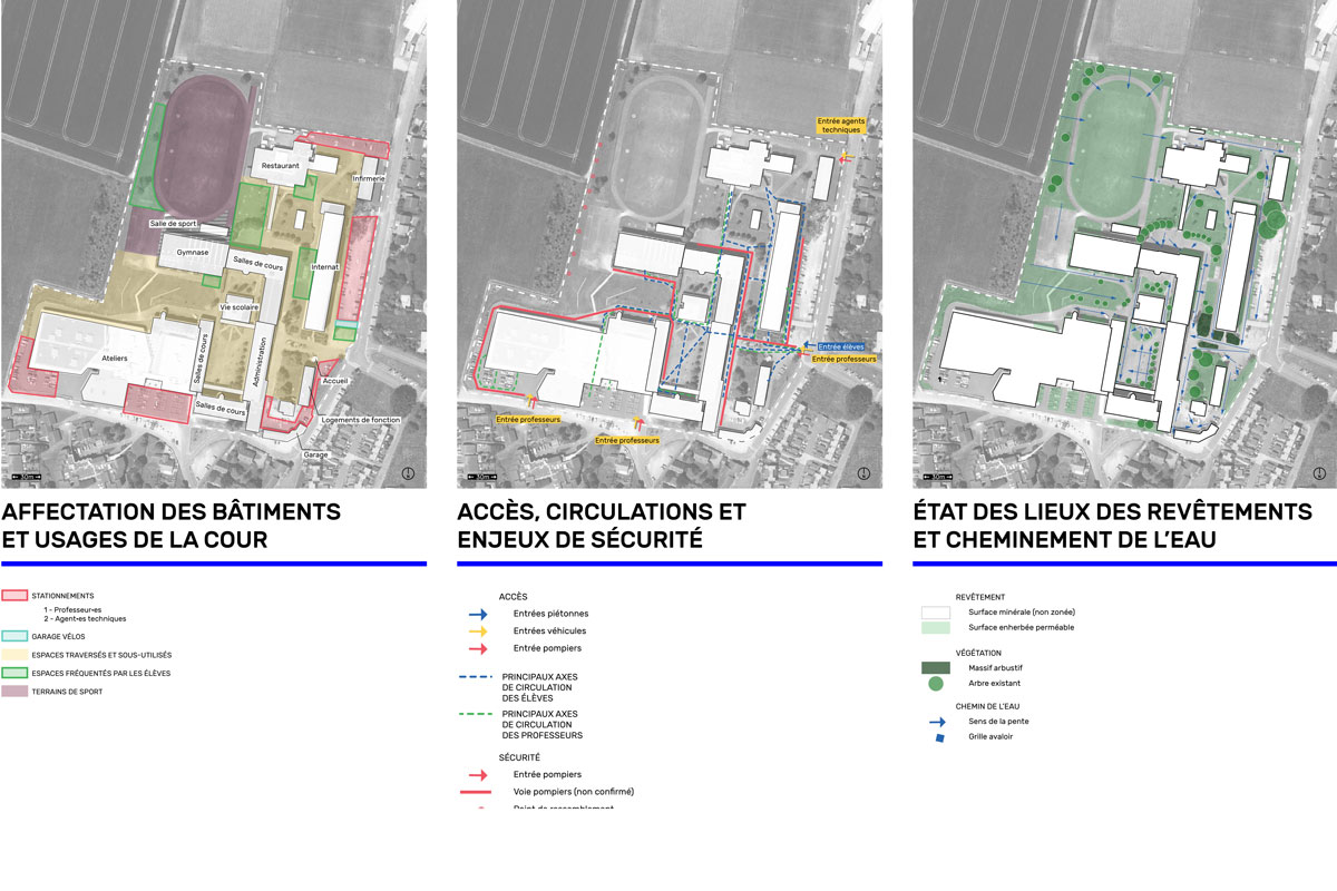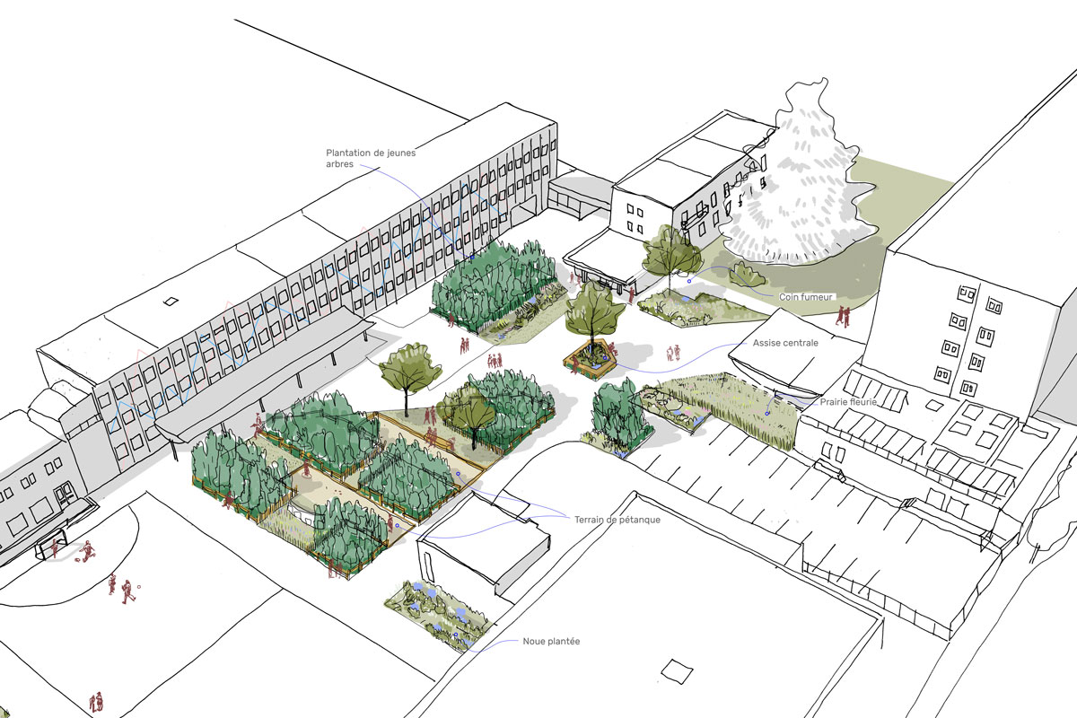 Dans le cadre de la mission lancée par la région Centre Val de Loire pour la renaturation, plantation de micro-forêts et la gestion intégrée des eaux pluviales dans une dizaine de lycées de la région, nous réfléchissons au devenir de des établissements Philibert de l’Orme, Jehan de Beauce et Rotroux. Suite à l’analyse de l’ensemble des établissements et au regard du budget de travaux alloué au projet, les aménagement s’orientent vers la renaturation de certains espaces de cour ainsi que la plantation d’arbres sous différentes formes selon les situations rencontrées (arbres d’alignement, micro-forêts, haies, taillis). La réflexion, soutenue par l’AESN, d’une gestion intégrée des eaux pluviales, sera structurante pour les nouvelles cours. Le réemploi des matériaux issus de la démolition sont une ambition forte portée par le projet également.