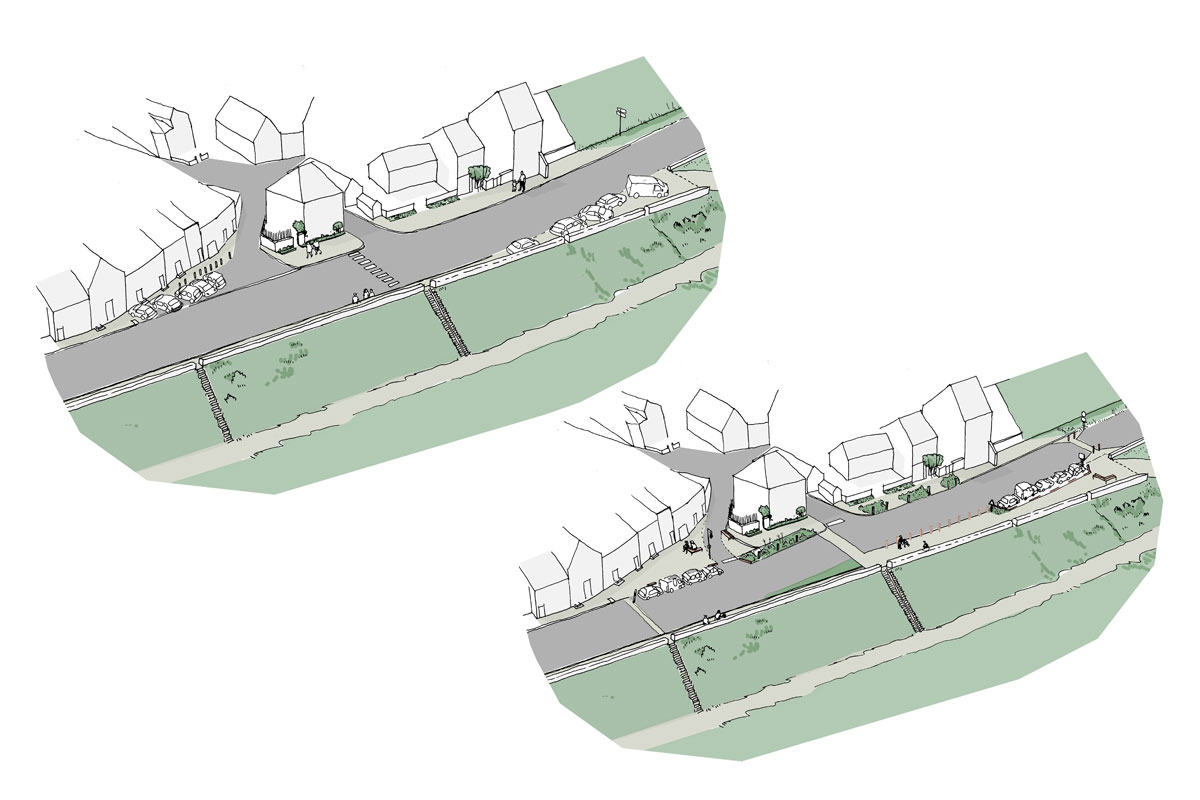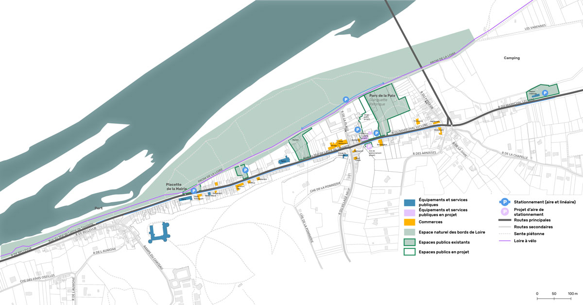 La commune de Chaumont-sur-Loire, située entre coteau et fleuve, est traversée par la route départementale 751 sur un linéaire de 2 km où l’automobile est omniprésente. La commune a déjà initié une dynamique de transformation de ses espaces de vie. Appuyée par le programme «Ville et Village d’Avenir», elle souhaite poursuivre cette dynamique par des aménagements de réduction de vitesse et d’espaces piétons de qualité en bord de Loire et à proximité du centre bourg. Malgré un nombre de visiteurs très important la commune ne compte qu’un peu plus de 1000 habitants et c’est donc dans une logique de sobriété financière que ces aménagements sont conçus. La commune a fait le choix de prioriser la transformation de ses entrées pour initier un changement d’usages. Le projet propose ainsi de reconfigurer le profil de la voirie aux entrées afin d’y dégager des espaces de vie sans faire une refonte complète des sols. Le réaménagement de ces points stratégiques est donc à apprécier comme une première étape qui permettra d’instaurer de nouveaux usages qui pourront être pérennisés à l’avenir par des aménagements plus qualitatifs sur le reste de la traversée.